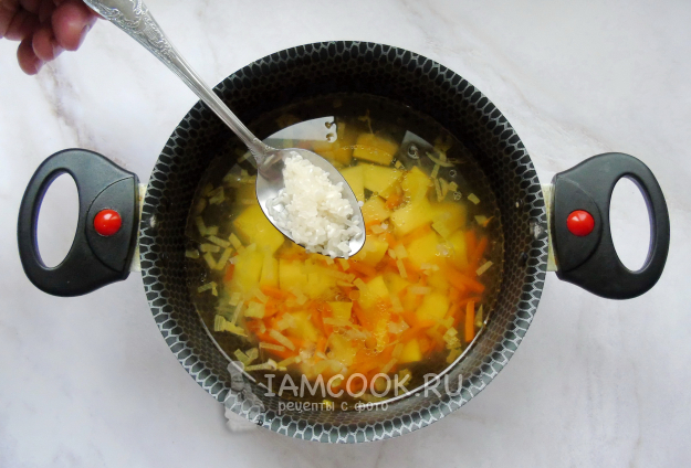 Когда бульон с овощами начнет кипеть, добавьте в кастрюлю промытый рис.