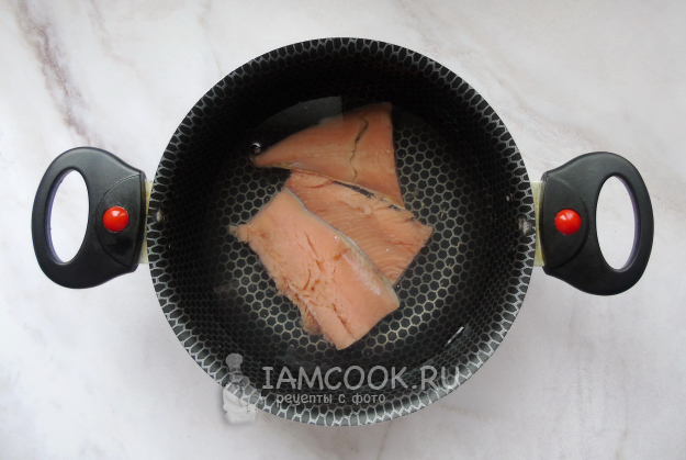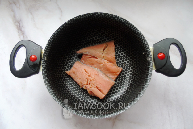 Доведите воду с горбушей до кипения, после огонь убавьте, снимите пену и варите рыбу 20-25 минут.