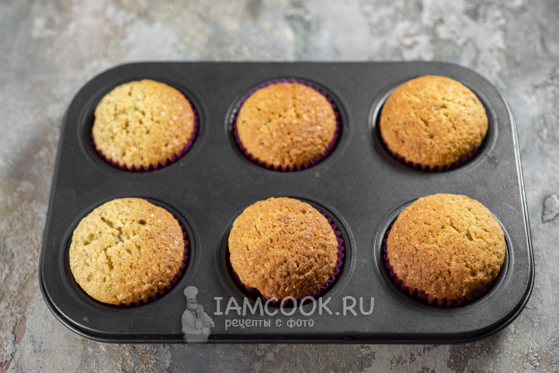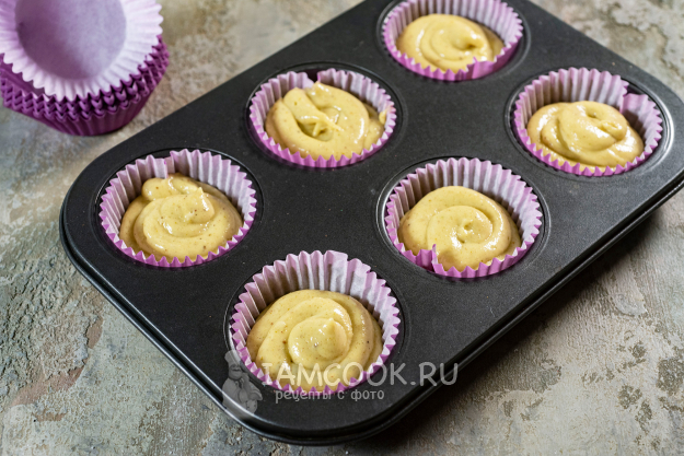 Я заполнила тестом кондитерский мешок, отрезала кончик и очень аккуратно заполнила на 2/3 от объема формочки для капкейков (бумажные вкладыши, вставленные в металлическую форму).