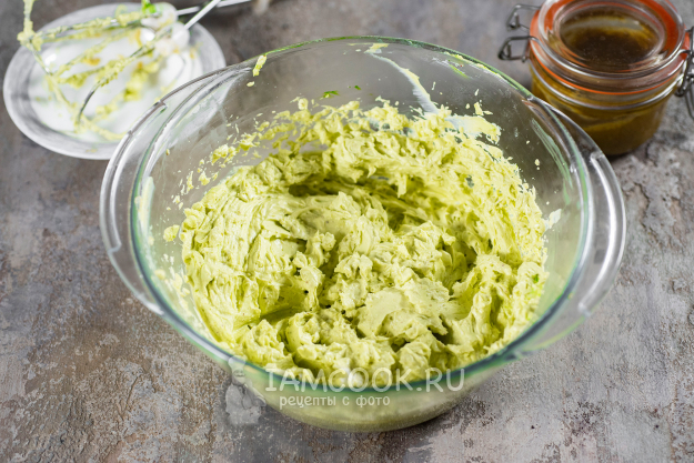 К которой добавим сливочный сыр и каплю зеленого гелевого красителя.