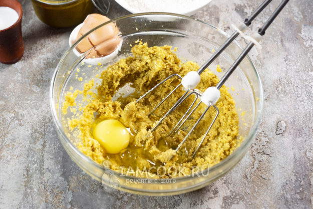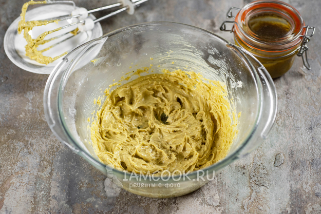 В миске соединим мягкое масло, фисташковую пасту, сахар, ванильный сахар. Миксером все эти ингредиенты будем взбивать до получения однородной смеси.