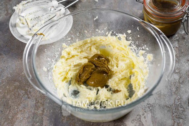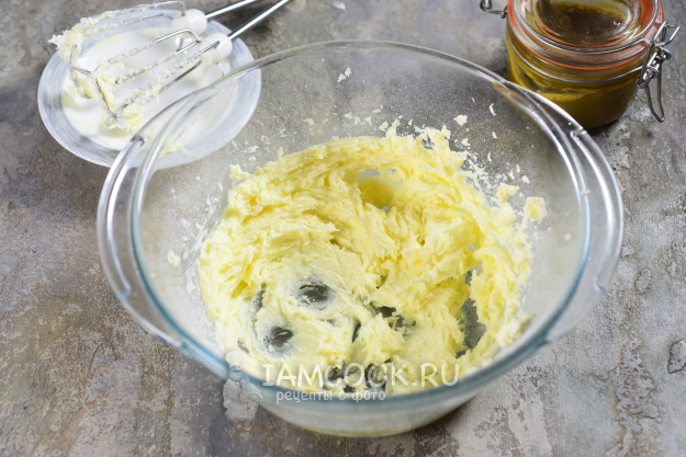 В миске взбиваем миксером мягкое масло с сахарной пудрой до получения кремообразной смеси.
