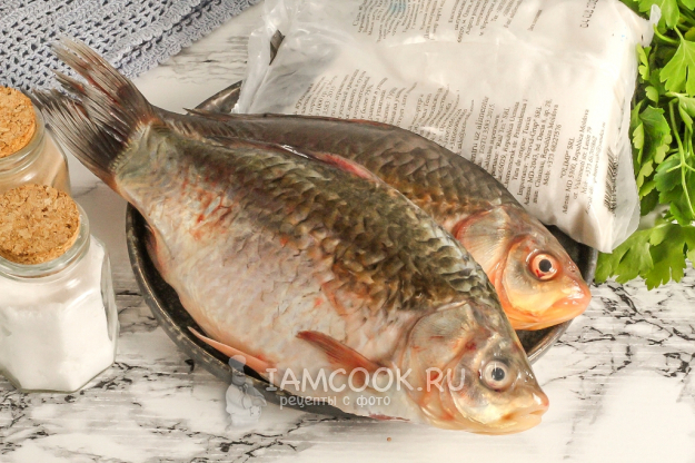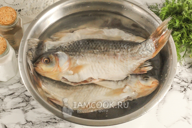 Удалите соль, промойте тушки и залейте их холодной водой. Вымочите карасей примерно 3-4 часа, меняя воду несколько раз. Это избавит рыбу от излишков соли.