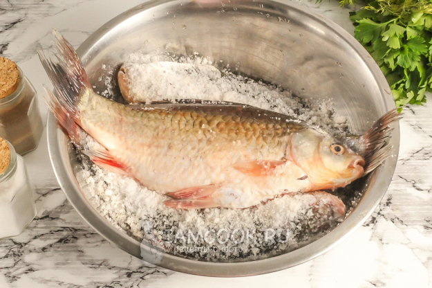 Карасей очистите от чешуи, внутренностей и тщательно выскоблите внутреннюю черную пленку. Если ее не вычистить, она придаст закуске горечь. Промойте рыбу в воде и обсушите бумажными салфетками. Высыпьте на дно глубокой емкости половину соли, всыпьте соль в брюшки рыб и засыпьте солью карасей сверху.