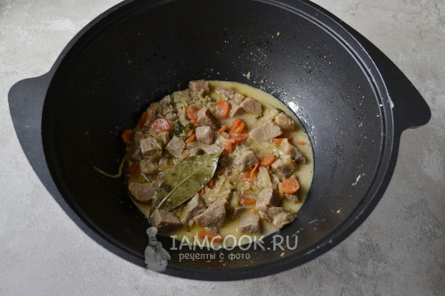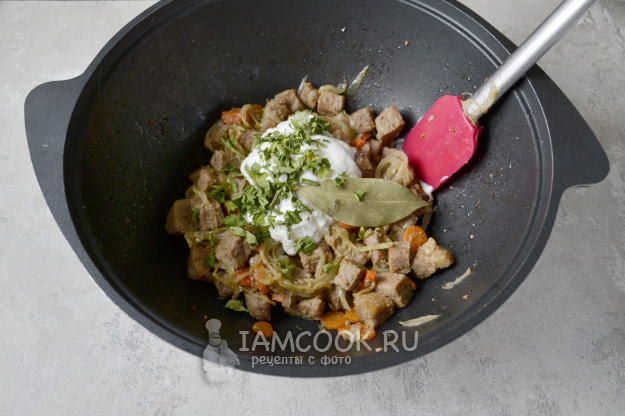 Добавьте в казан сметану, лавровый лист и сушеную зелень. Влейте полстакана горячей воды.