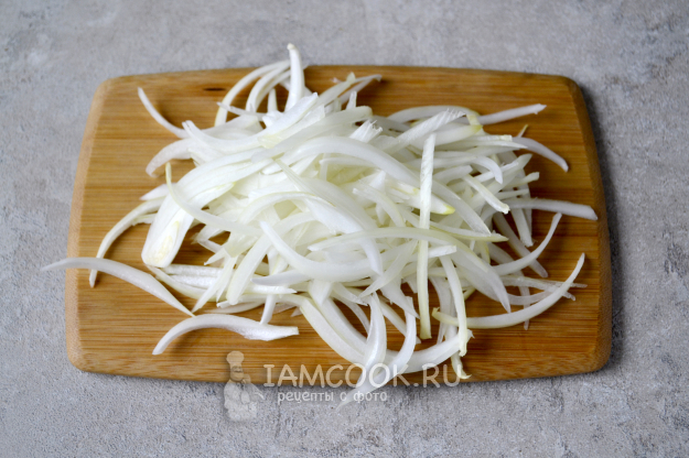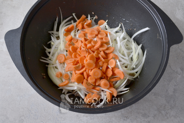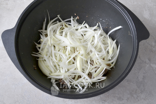 Когда жидкость выпарится, положите в казан лук. Можно влить немного растительного масла.