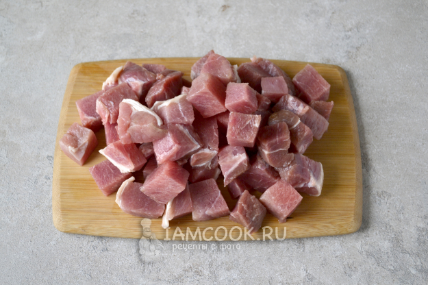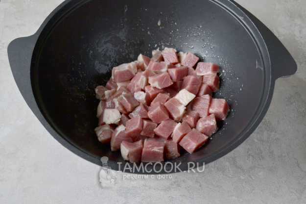 Хорошо разогрейте казан с растительным маслом и положите в него нарезанное мясо.