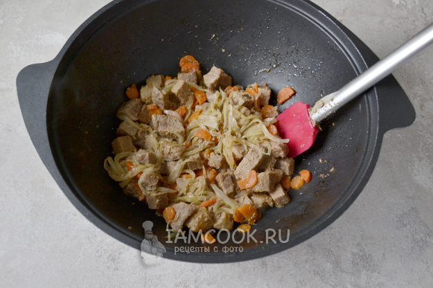 На огне выше среднего обжаривайте мясо, пока не выпарится жидкость. Во время обжаривания перемешивайте мясо.