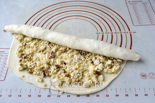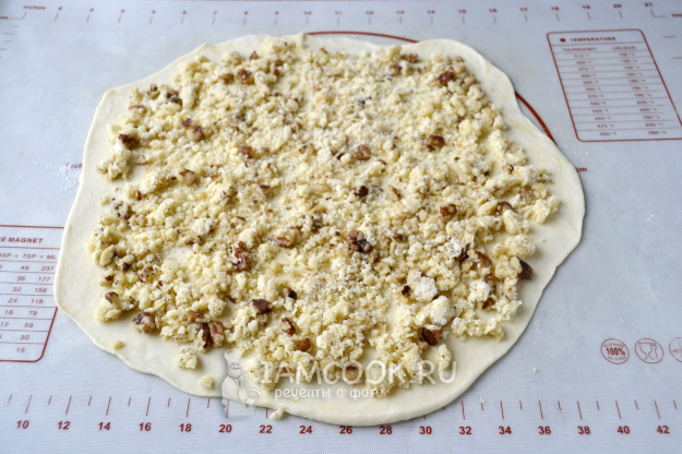 Для удобства разделите тесто на две части. Раскатайте первую часть на подсыпанном мукой столе в тонкую, 5-6 мм, лепешку. Равномерно разложите половину начинки.