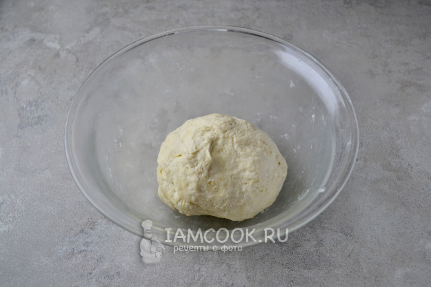 Быстро замесите тесто. Оно получается очень мягким, слегка липнущим к рукам. Затяните миску пищевой пленкой и поставьте в холодильник, пока будете готовить начинку.