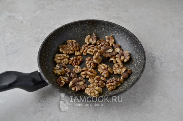 Грецкие орехи подсушите на сухой сковороде и порубите ножом до крошки.