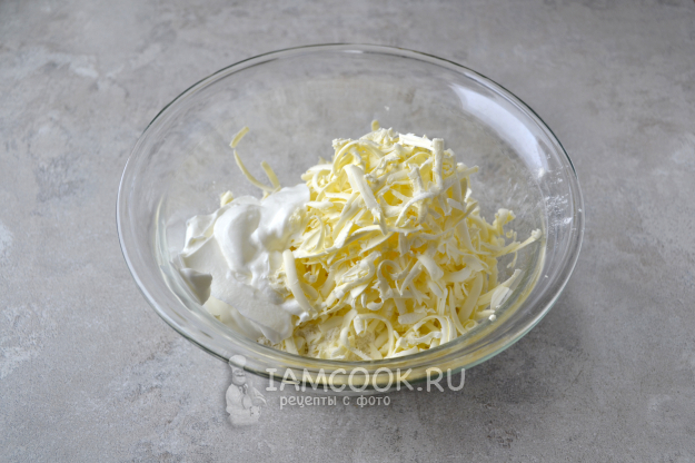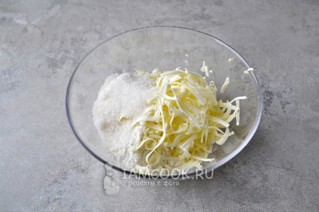 В глубокую миску просейте муку (350 г), добавьте сухие дрожжи, сметану и натрите на крупной терке сливочное масло (100 г).