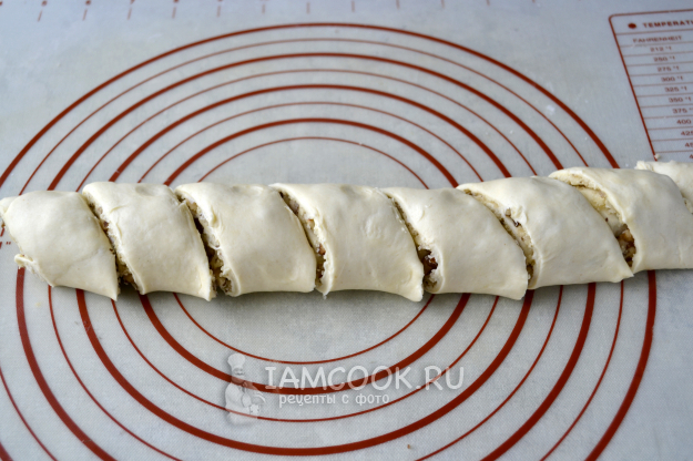 Разрежьте рулет на кусочки 3-4 см шириной. Сделайте то же самое со вторым куском теста.
