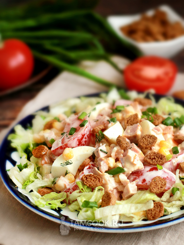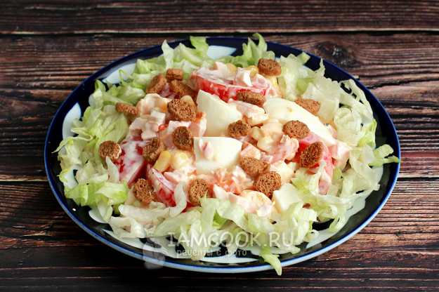 Для подачи на блюдо выложите в центр салат, вокруг разложите измельченные свежие листья Айсберга или пекинки, разбросайте сухарики.