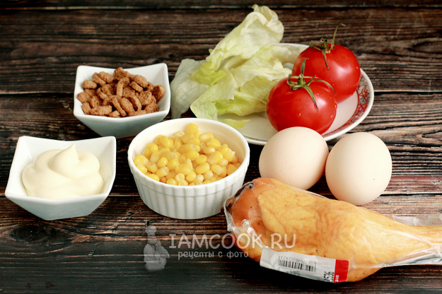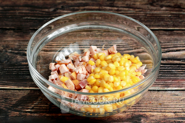 В салатник для смешивания отправьте нарезанную копченую курицу и консервированную кукурузу. Я предпочитаю курицу нарезать помельче, но вообще все составляющие в салате нарезаются довольно крупно, чтобы продукты были видны.