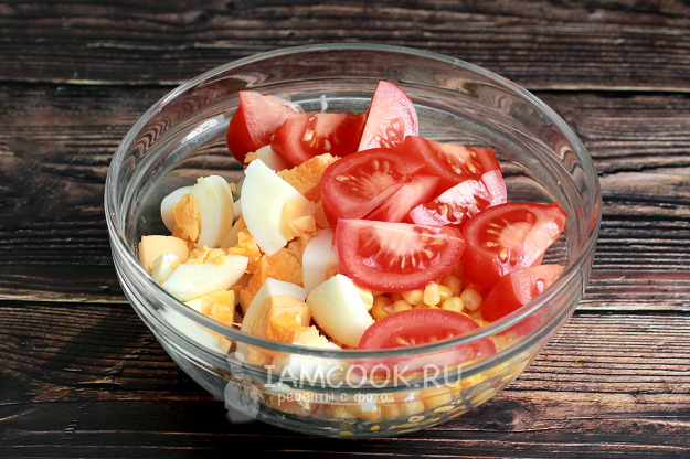Добавьте помидоры и отварные яйца.