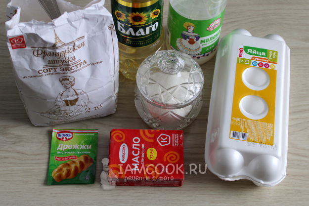 Для дрожжевого теста «Водолаз» подготовьте ингредиенты по списку к рецепту. Обратите внимание на то, что все ингредиенты должны быть комнатной температуры. Поэтому продукты из холодильника (молоко, сливочное масло и т.д.) нужно заранее достать.