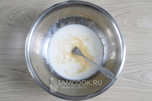 Влейте тёплое или комнатной температуры молоко. Перемешайте.