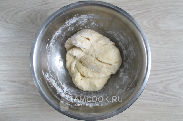 Затем начните вымешивать тесто, при необходимости, т.е. если оно получается слишком липким, добавляйте в него порциями муку. Но не забивайте тесто лишней мукой!