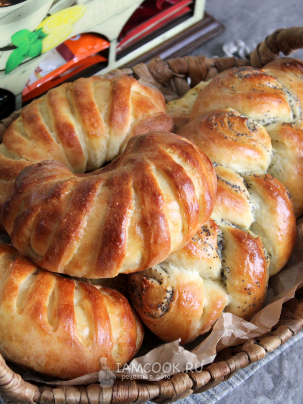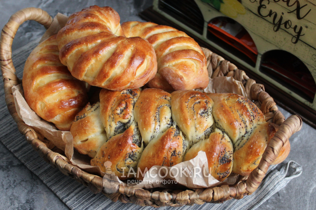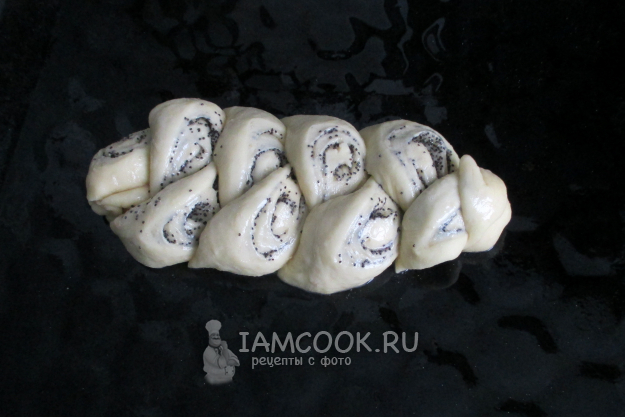 Вторую часть теста разделите на две половины. Каждую раскатайте в прямоугольную заготовку, посыпьте маком и сахаром и скрутите в рулет. При помощи ножниц делайте надрезы наискосок. Отгибая тесто с начинкой, сформируйте фигурную булочку в виде плетенки, косички, колоска и т.п.
