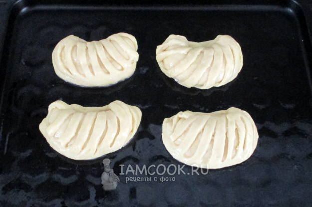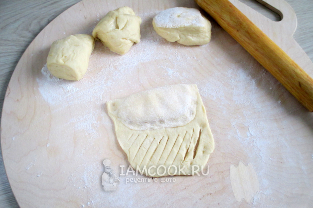 Уложите порцию начинки на одну сторону теста так, как показано на фото. На части теста без начинки сделайте косые надрезы ножом. Сформируйте булочку.