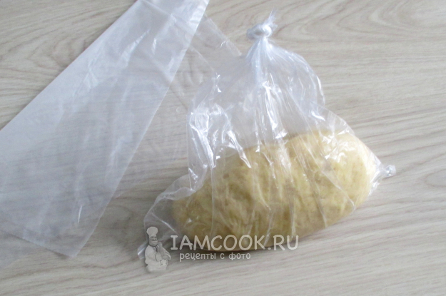Полученный комок теста поместите в пищевой пакет, который изнутри нужно смазать растительным маслом. Выдавите воздух и хорошо завяжите концы пакета.
