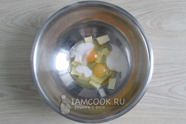 Размягчите кусочки сливочного масла, добавьте в него растительное масло без запаха, сахар, соль и яйца. Перетрите до равномерного состояния.
