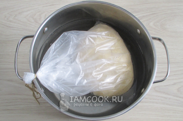 Поместите всё это на всякий случай по второй пакет. Завяжите его плотно ниткой. Поместите тесто в пакетах в кастрюлю с водой комнатной температуры или теплой (30-40 градусов). Тесто окажется на дне.