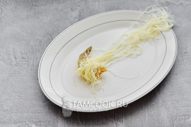 Подготовьте размороженное тесто катаифи, накрыв его влажным полотенцем или поместив в пакет. Отделите от мотка теста небольшое количество нитей, разложите на поверхности, положите на один край замаринованную креветку и, начиная с головной части, обмотайте креветок нитями теста катаифи.