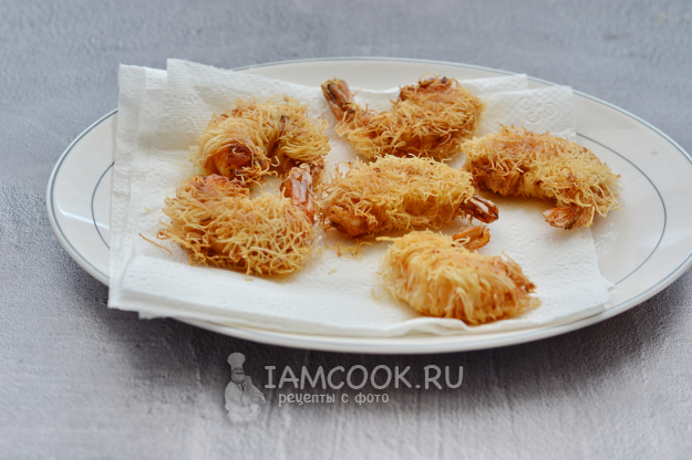 Обжаренных креветок катаифи положите на бумажные полотенца, чтобы впиталось излишнее масло, и можно подавать!