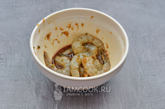 Креветок берите лучше не отваренных (розовых), а сырых. Сырые креветки серые по цвету. Разморозьте их полностью в пакете, очистите, оставив хвостики.