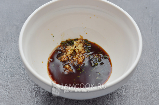 Для маринада смешайте соевый соус, лимонный сок, листики тимьяна и чеснок через пресс.