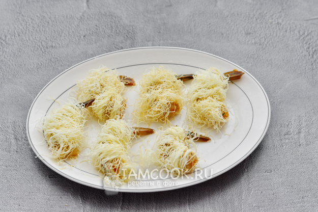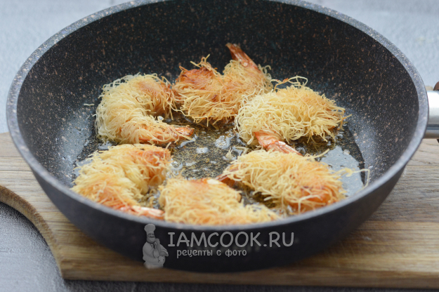 Разогрейте в сковороде около половины стакана масла и обжаривайте креветок в тесте катаифи с двух сторон до золотистой корочки. Можно обжарить и во фритюре.