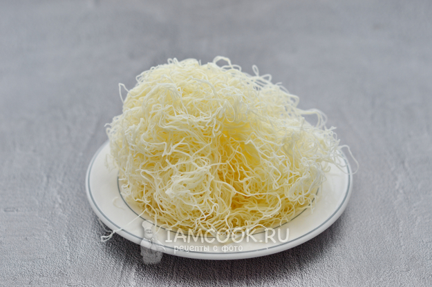 Вот так тесто катаифи выглядит в размороженном виде - тончайшие нити. В составе - мука, крахмал, растительное масло, соль, вода. Приготовить его в домашних условиях практически невозможно, но оно не особо дорогое, по цене - как тесто фило.