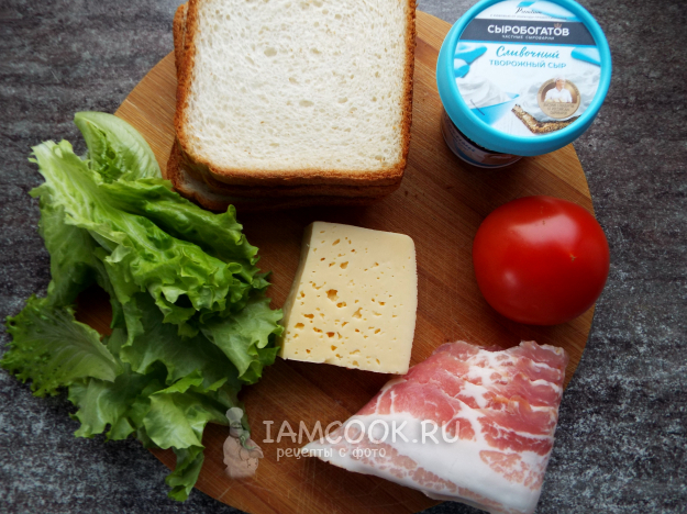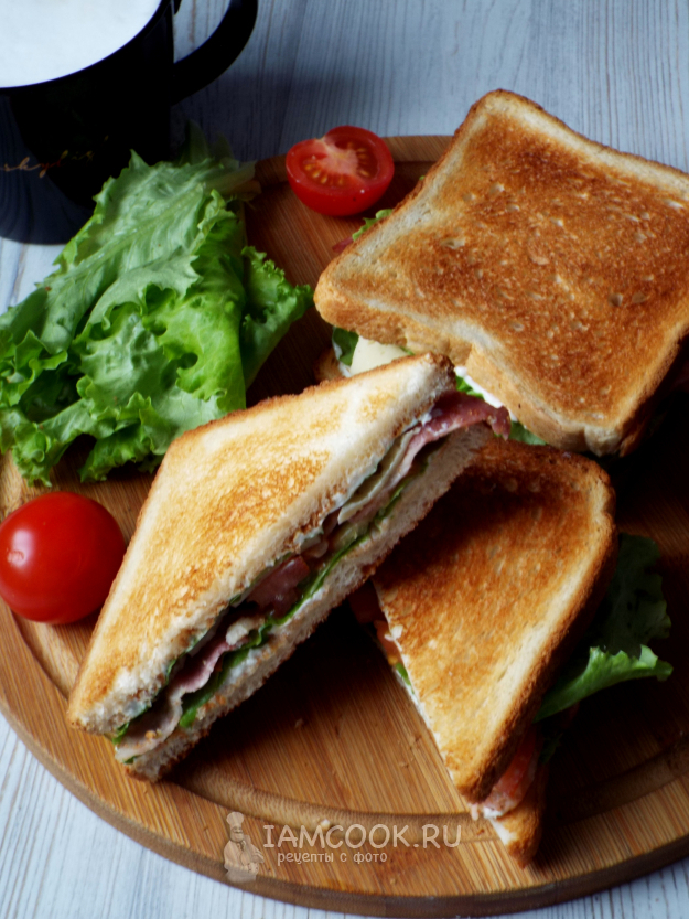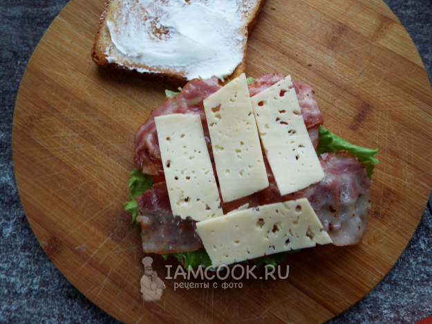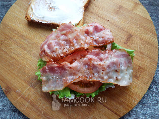 Конечно, вариаций начинки может быть множество, но я выбрала именно такое сочетание. Считаю, что зелёный салат и помидор прекрасно освежают такой бутерброд, а сыр и поджаренный бекон делают его сытным.