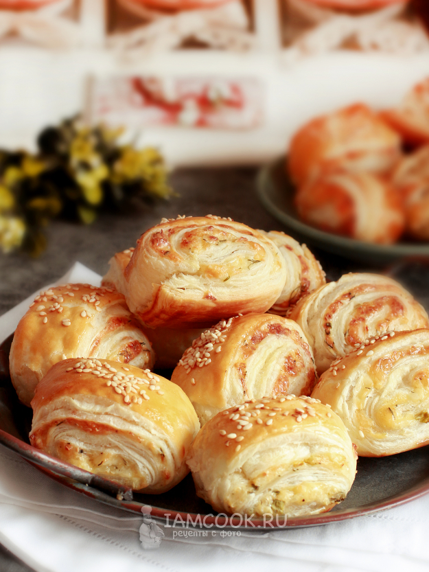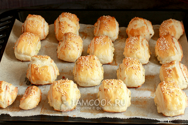 Булочки из слоеного теста с сыром и творогом готовы. У меня вышло 17 штук и два маленьких краешка.