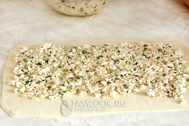 Для удобства в работе слоеное тесто разделите на две части. По очереди раскатайте тесто на столе очень тонко. Выложите половину начинки, отступая от края по 2 см.