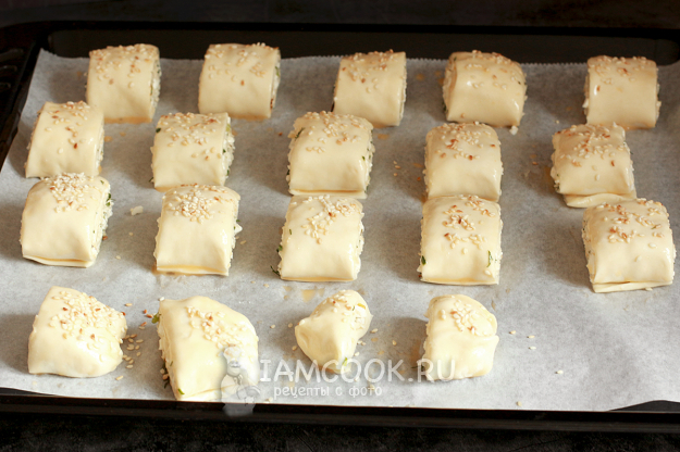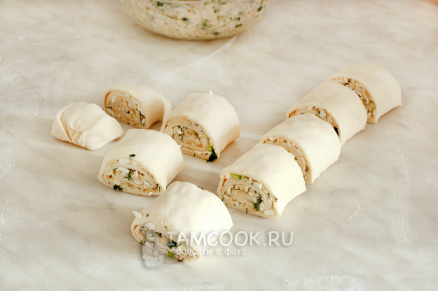 Нарежьте рулет на кусочки шириной 3 см. Повторите процедуру с оставшимся тестом.