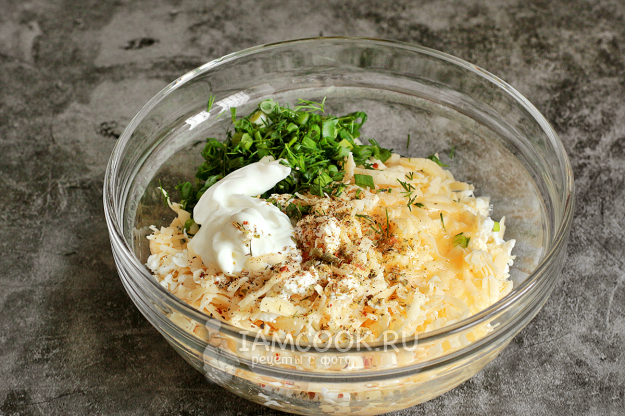 Соедините в миске творог, сыр, яйцо, сметану, рубленую зелень. Посолите и добавьте специи по вкусу. Обращайте внимание на консистенцию творога и добавляйте сметану, чтобы сделать начинку более пластичной. Посолите и сдобрите специями по вкусу.