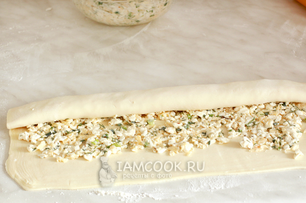 Сверните тесто с начинкой в рулет, слегка его приплюсните и защипните краешки.