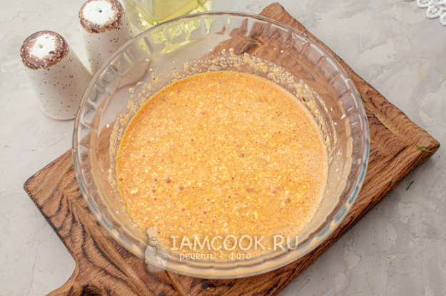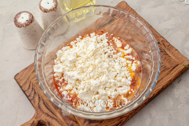 Массу можно пробить блендером, для того чтобы она получилась более однородной, или просто соединить венчиком или вилкой. Мне больше нравится второй способ, когда в готовом омлете попадаются небольшие крупинки творога.