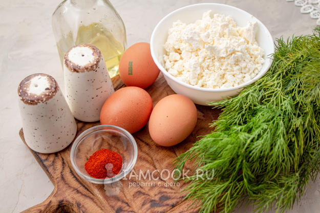 Все необходимые продукты для приготовления творога с яйцом на сковороде - перед вами.