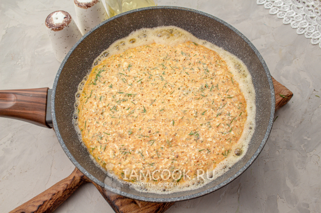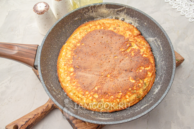 Аккуратно переверните омлет и готовьте еще 3-4 минуты со второй стороны.