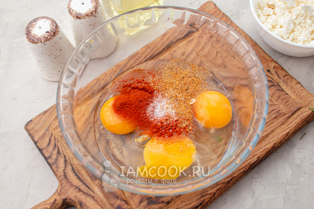 В миску вбейте куриные яйца, добавьте сладкую молотую паприку (если не любите, не добавляйте), соль и черный молотый перец. Перемешайте вилкой или венчиком.