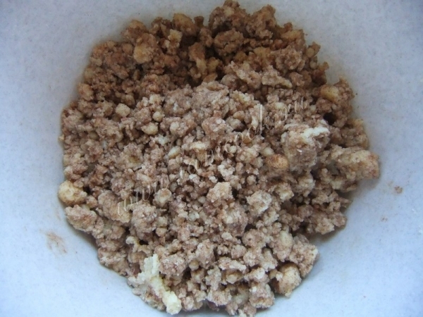 Приготовим крошку: базовый рецепт крошки - 1:1:2 - масло-сахар-мука. Если вы хотите более хрустящую крошку, то возьмите муки на 50 грамм меньше, как и я. Добавим корицу и разотрем руками в крошку.