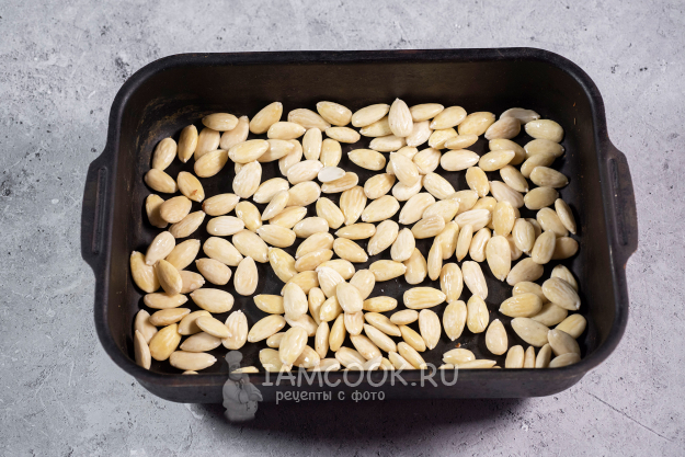 Очищенный миндаль выложим на противень равномерным слоем и подсушим в разогретой до 150 градусов духовке около 15 минут.