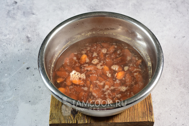 Орехи миндаля выложим в миску и зальем на 5 минут крутым кипятком.