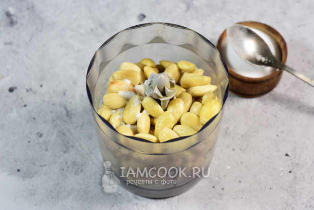 Затем охлажденный миндаль выложим в чашу блендера, добавим соль. Будем включать устройство импульсно и довольно долго перерабатывать орехи, при каждом выключении аккуратно снимаем ореховую массу со стенок чаши блендера. Измельчаем миндаль таким образом примерно 30-35 минут (зависит еще от мощности вашего блендера).