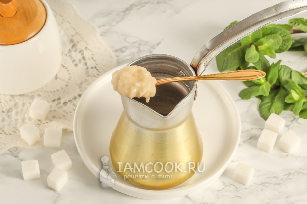 Заварите банановый кофе 2-3 минуты на умеренном нагреве. Как только пена вырастет - сразу же выключайте нагрев. Дайте напитку отдохнуть 1-2 минуты, чтобы осела гуща.