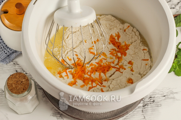 Всыпьте в емкость пшеничную муку высшего сорта, разрыхлитель. Натрите цедру с апельсина и добавьте ее к остальным ингредиентам. Тщательно перемешайте.